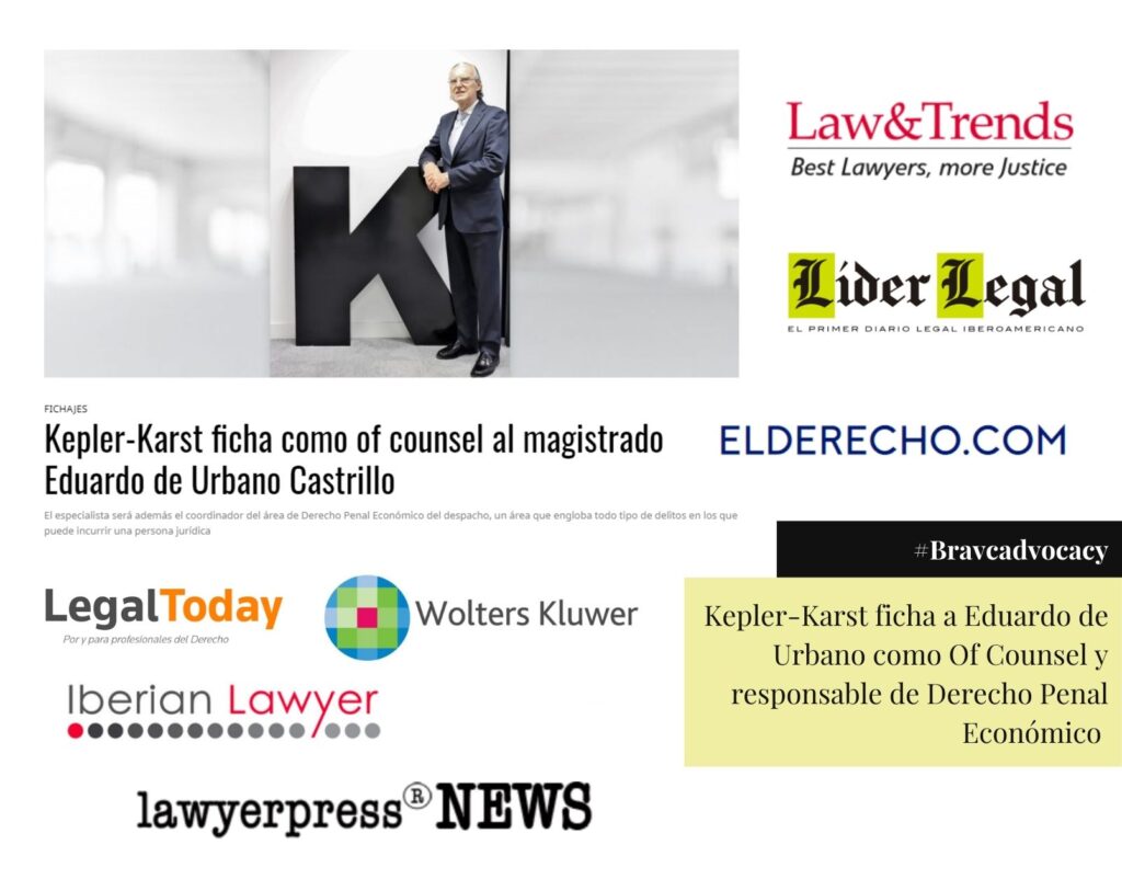 Iberian Lawyer, Law and Trends, Líder Legal, Lawyerpress, El Derecho y El Jurista se han hecho eco de la noticia de la incorporación del magistrado Eduardo de Urbano –ahora en excedencia- a Kepler-Karst. De Urbano se incorpora como Of Counsel y responsable del área de Derecho Penal Económico, un área que engloba todo tipo de […]